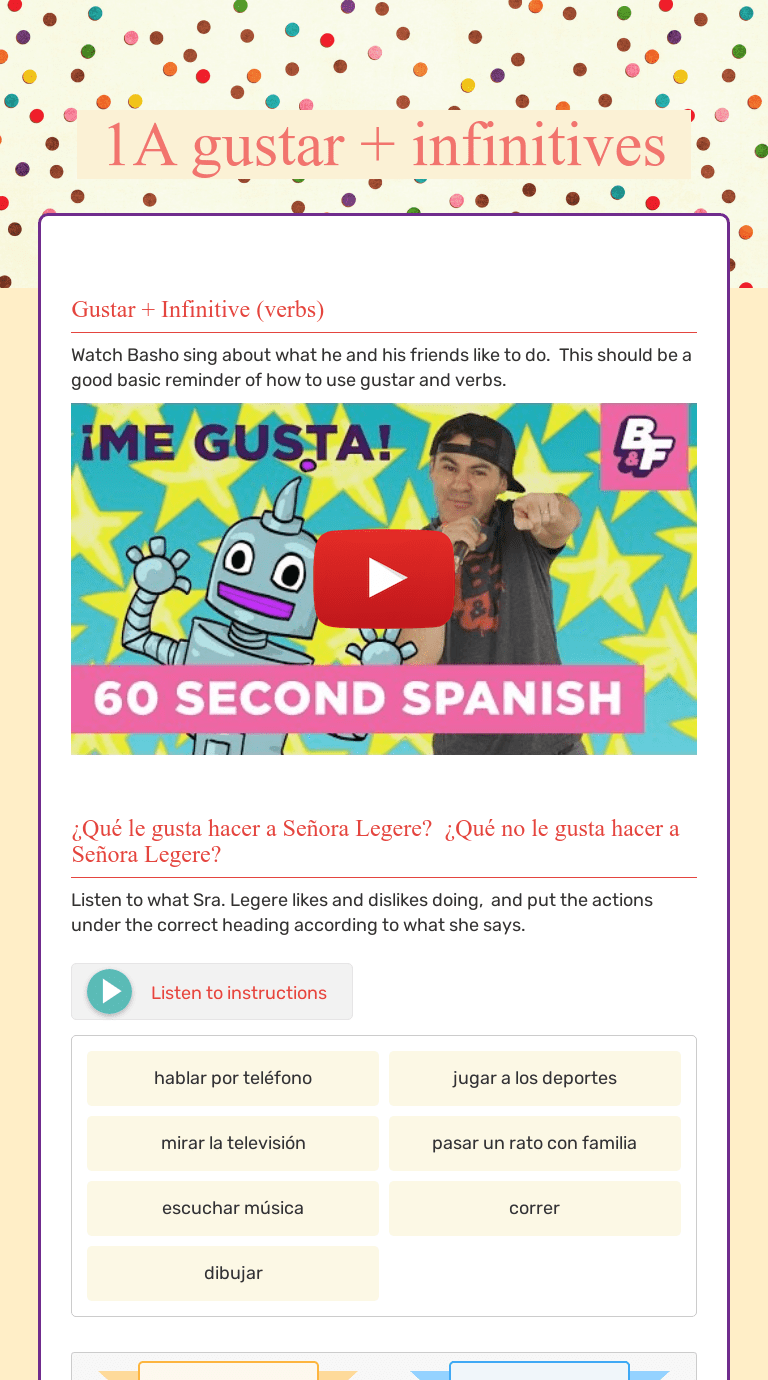 I will include an answer key when i have time. Spanish powerpoint using gustar with the infinitive. To say that you like something in spanish using gustar, you have to rearrange the words. Improve your spanish knowledge with free questions in recognize the correct form of gustar + infinitive and many other spanish skills. Ċ, regular verb vocabulary practice with infinitives.pdf